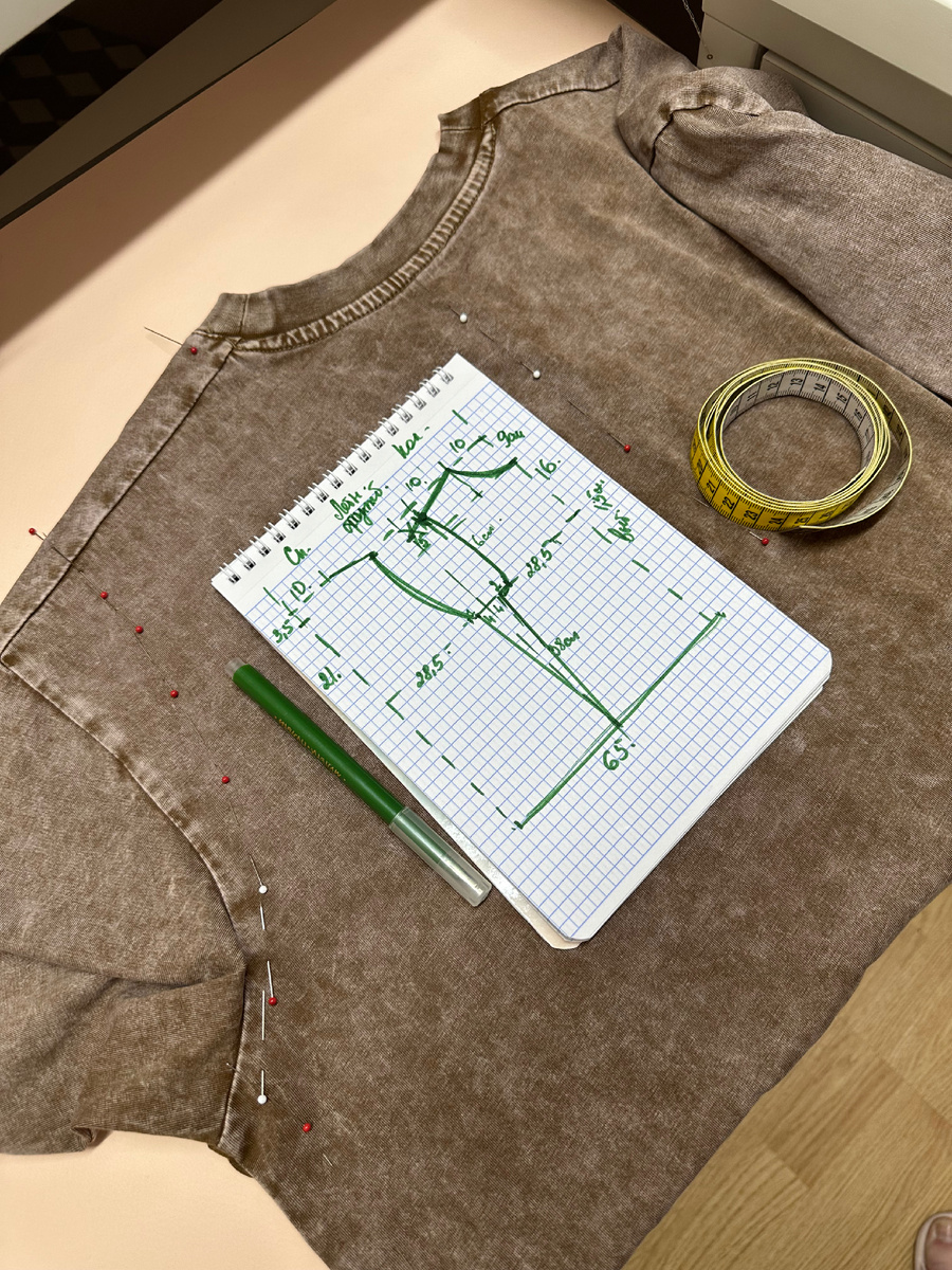 Странный подход для профессионального конструктора, согласитесь? Это на первый беглый взгляд. Кто, как ни человек, который вручную на картоне ( не то что сейчас в программах на компе) отрабатывал 3-5 эскизов в неделю, понимает когда нужно заморачиваться с формулами, а когда уже следующий этап. Формулы и зависимости нужны на первоначальном этапе в построении основы. Если она у вас есть, то вы красавчик! Берите, моделируйте и вяжите в удовольствие. Если нет, то ничего страшного. Можно взять любую трикотажную футболку за основу, отметить на ней новые конструктивные линии, смоделировать, что нужно ( я, например, потом японское плечо из этого всего сделаю.) Как буду делать, покажу в закрытой группе телеграмм. Есть возможность сделать это со мной. У меня традиция: пока проект не закончен, вход бесплатный. Единственное условие, вязать. Зрителей прошу не беспокоиться. Это не потому, что я жадина-говядина, а потому что, пока не попробуешь, не поймешь истинную ценность. Это футболка