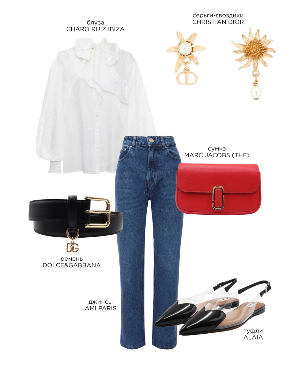 Блуза, джинсы, сумка, туфли, ремень, серьги