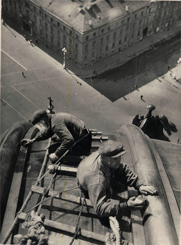 А на этом снимке мы видим уже послевоенное время, и во всю идет очистка купола Исаакиевского собора от маскировочной краски. Это была очень важная задача, связанная с сохранением исторического облика памятника архитектуры.