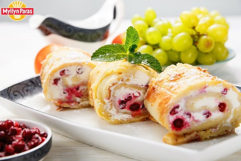 1 ст. л. сахара ☀Способ приготовления Яйца взбейте с сахаром и солью, добавьте теплое молоко и муку, хорошо размешайте миксером, добавьте растопленное сливочное масло. Духовку разогрейте до 200 градусов. Противень застелите бумагой для выпечки, так чтобы бумага заходила за края, смажьте маслом. Вылейте тесто и выпекайте 20-25 минут до румяной корочки. Из указанного количества ингредиентов лучше испечь два блина. Тесто поднимется буграми, но в готовом виде оно опадет, так и должно быть. Дайте блину немного остыть. Для начинки взбейте творог со сметаной и сахаром. Намажьте блин творожной массой, посыпьте хаотично ягодами. Сверните рулет. Разрежьте на кусочки. Начинку можно приготовить и не сладкую: мясную,