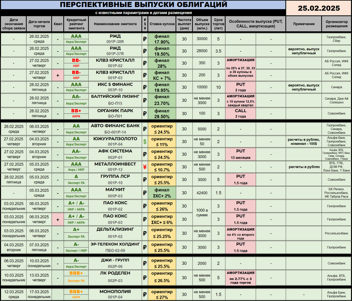 ✌️ Добрый вечер, друзья! Вновь анонсов с горкой, разбираемся :) ---------- 🆕 НОВЫЕ РАЗМЕЩЕНИЯ / АНОНСЫ: ❄️ ИКС 5 ФИНАНС (🅰️🅰️🅰️) за час без лишних глаз провел сбор заявок на выпуск 003Р-10. Несмотря на большую вероятность непубличности, расскажу параметры: 10 миллиардов, 10 лет торгов (пут-оферта через 2 года), ежемесячный купон со ставкой 19,95%. Увы, компании наивысшего рейтинга сползают ниже актуальной ключевой. Начало торгов - 28 февраля. ❄️ МЕТАЛЛОИНВЕСТ (🅰️🅰️🅰️), начав торги годовых выпускам в юанях, сразу предлагает новый, но уже на 2 года. Выпуск 001Р-12: заявки собирать компания будет 27 февраля, вновь юаневые бумаги с расчетами в рублях, объем - не менее 500 миллионов юаней, оферт нет. Ориентир ставки - не выше 10,7%. Начало торгов - 5 марта, организаторы: ВТБ, ГПБ, ДОМ . РФ, Джи Ай Солюшнс, Локо-Банк, Т-Банк. ❄️ СЕЛИГДАР (🅰️🅰️➖ / 🅰️➕) собирается за новым выпускам, да в рублях. Компании потребуются деньги в первой половине марта, поможет им выпуск 001Р-02. Дву