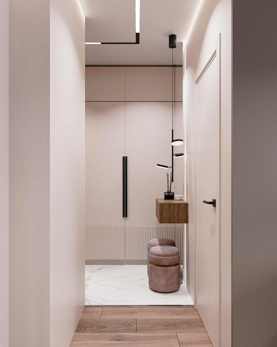 Для узкого коридора, например, оптимально подойдут светлые и нейтральные оттенки. Белый, светло-серый или пастельные тона помогут визуально расширить пространство, сделав его более открытым и светлым. Эти цвета отражают свет, что особенно важно в узких и темных коридорах, где естественного освещения может быть недостаточно.