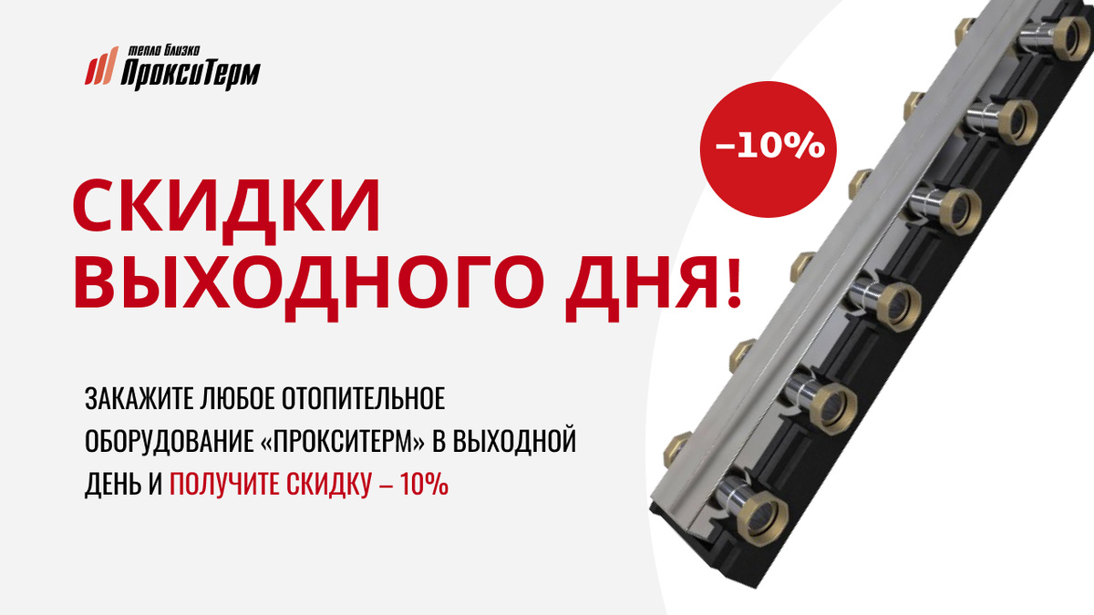 Заработать, тратя деньги - это, как известно, утопия. Правда, существует и распространенное мнение, о том, что каждый сэкономленный рубль - это заработанный рубль. Вот об этом мы и поговорим. Компания “ПроксиТерм” вновь запускает акцию - “Скидки выходного дня”. Идея предельно проста: на сайте ПроксиТерм в выходной день можно заказать оборудование для системы отопления из каталога со скидкой 10%. Почему именно в выходной? Чтобы дать время покупателю подумать, определиться в спокойной атмосфере, не отвлекаясь на работу. Скидка 10%, а много ли это? Ну, например: Гидрострелка из нержавеющей стали GS 20 стоит 8950 руб. - надежное оборудование обеспечивающее корректную работу отопительных систем с несколькими отопительными котлами (предотвращает гидравлические удары, поддерживает баланс тепла и давления). При покупке такой гидрострелки можно сэкономить/заработать 895 рублей. Немного? Так можно купить что-то посерьезнее. Например, Дешламатор-деаэратор D-D(100F) для очистки системы отопления