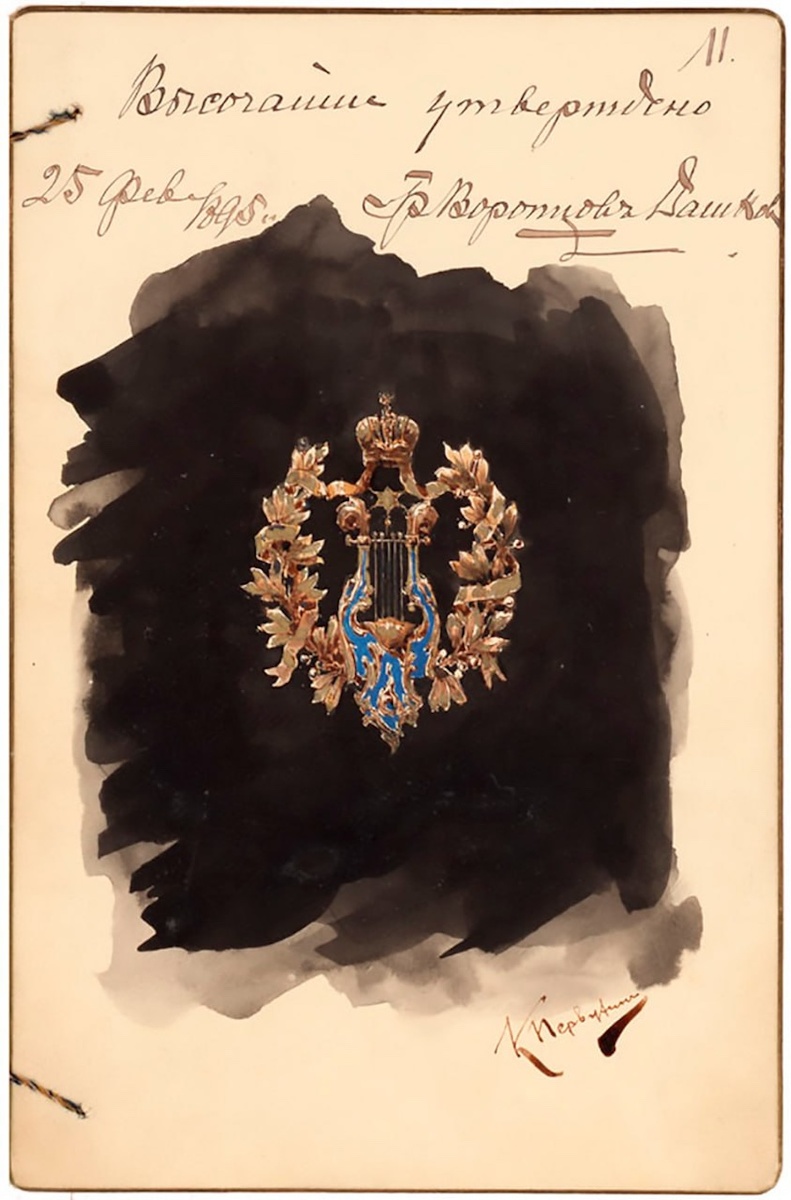 В 1888 году возникла мысль об установлении особого знака отличия для артистов императорских театров, которые своим выдающимся талантом и продолжительной артистической деятельностью заслуживают особого внимания и поощрения. Идея эта и общие основания новой почетной награды были тогда же одобрены министром императорского двора графом И.И. Воронцовым-Дашковым, и утверждены императором Александром III. 25-го февраля 1895 года император Николай II утвердил составленный художником К- К. Первухиным рисунок этого знака. Он представляет собой голубую эмалевую лиру с золотым орнаментом и с золотой звездой наверху; лира заключена в лавровый венок, обвитый лентой и увенчанный императорской короной; венок, ленты и корона – золотые. Знак высотой 5 сантиметров и шириной 4 сантиметра. Носится он на левой стороне груди. Рисунок К. Первухина сейчас хранится в РГИА. С момента утверждения и до 1917 года этим знаком артистического отличия отмечены 57 человек, среди них 10, имеющих отношение к балету: балет