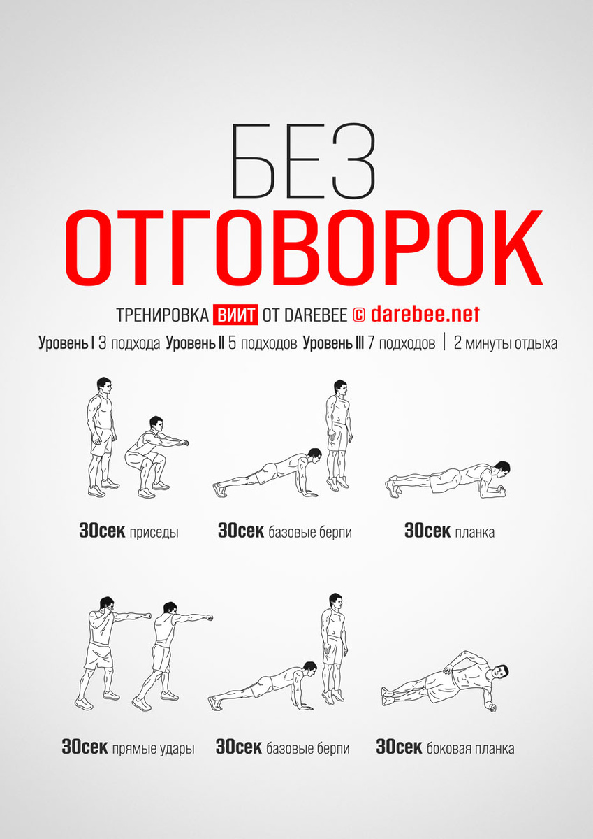 Новый релиз — Без отговорок. ЦЕЛЬ: кардио ТИП: жиросжигание СЛОЖНОСТЬ: 3 — подходит для начинающих Эта тренировка убирает все отговорки, которые вы можете себе придумать, чтобы не заниматься спортом. https://darebee.net/out-of-excuses-workout.html #darebeenet #дареби #фитнесдома #домашняятренировка #darebee #тренировка #кардио