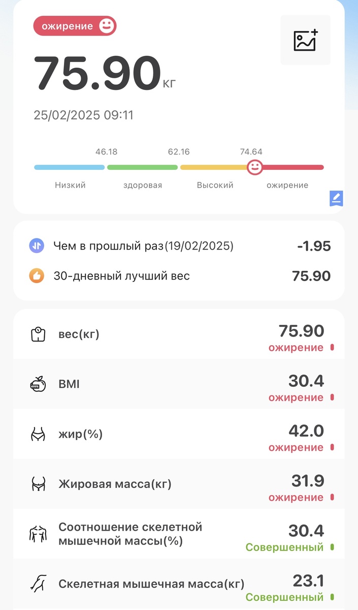 Всем привет! Меня зовут Даша, мне 24 года и я недавно стала мамой💕.Я в начале пути похудения с 77 до 60 килограмм. Худею на 1200-1300 калорий в день. Здесь вы увидите мои рецепты, результаты и подход в процессе похудения. Создала блог для того чтобы была мотивация, я с вами честна и открыто пишу обо всем, что у меня происходит. Первым делом проснувшись утром я побежала на весы и что они показали?) 75,9 кг ‼️ А это еще одна победа 🥇 У меня умные весы, но этой функцией я не так часто пользуюсь. Сегодня решила ею воспользоваться чтобы потом сравнить результаты, пока я в начале пути. Я в стадии ожирения😳 и большинство показателей в плачевном состоянии, а мой метаболический возраст вообще +10 лет. Думаю через месяц или недели 3 можно будет показать для сравнения изменения. Завтракала я поздно, у дочи сегодня особенно болели десна. Сегодняшний пост тоже не стала делить на 2 части, провела больше времени с ребенком, в такие моменты мы им особенно нужны. День начался с перекуса йогурта
