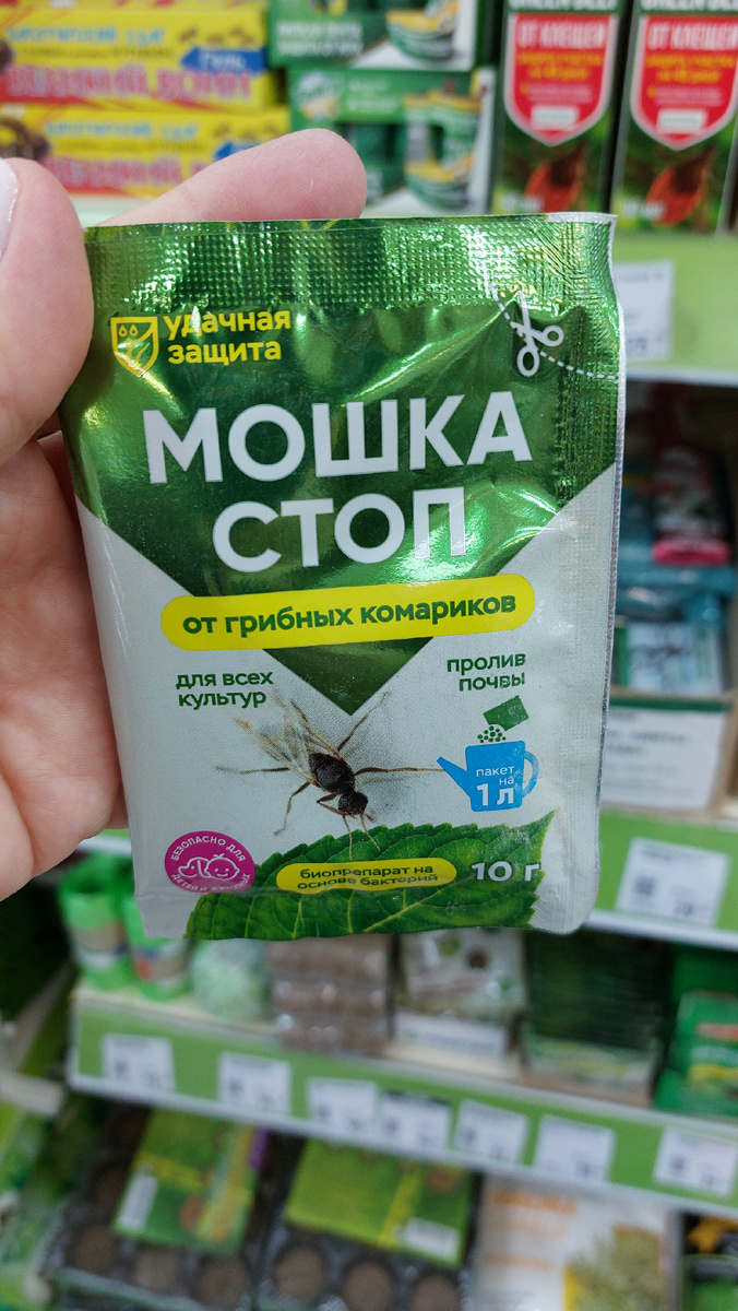 Мошка стоп, по отзывам из прошлых лет, средство эффективное от грибных комариков. 10 г, нужно развести пакет на 1 л. Цена 70 рублей. Указано безопасно для детей и животных.