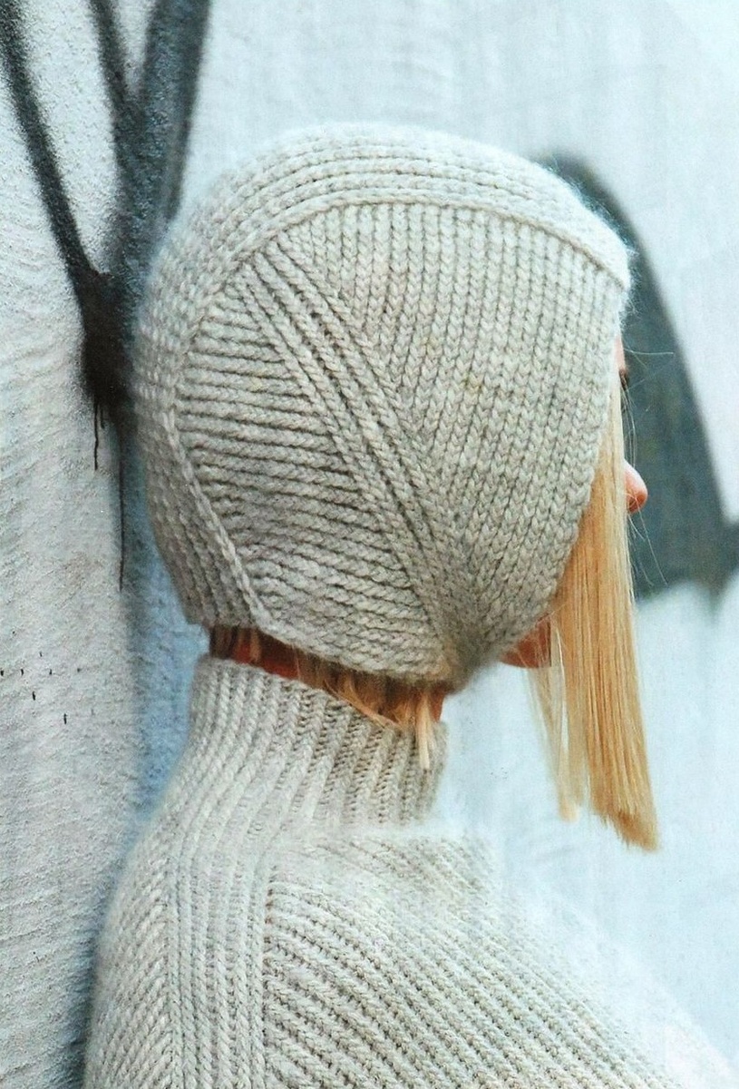 Вам потребуется: шерстяная или с содержанием шерсти пряжа, спицы N 3-3.5, застежка-кнопка. 7 ШАПОЧКА-ШЛЕМ** РАЗМЕР 56-58 Привычные и всеми любимые вязаные шапки - это настоящий символ зимы, мороза и хрустящего под ногами снега. Разнообразие пряжи дарит нам практически неограниченный выбор как в цветовых решениях, так и в стиле и фасоне. В списке самых модных головных уборов балаклавы и различного рода капоры, или их разновидность шлемы, занимают одну из наивысших строчек. Конечно, и балаклавы, и капоры беспощадны к прическе, зато точно защитят от непогоды. В любом случае, данный аксессуар на удивление легко сочетается с любой верхней одеждой, от пальто до курток. Стильные модели балаклавы, в отличие от их функциональных сестер, используемых в автоспорте или лыжном спорте, не должны слишком обтягивать голову. Более выигрышно они смотрятся, когда на пару размеров больше размера головы. Капоры вновь возвращаются в моду, а вместе с ними возникает и масса вопросов о том, что это такое и как