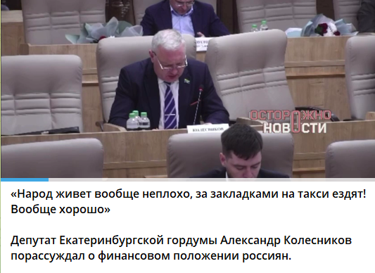 С неожиданной точкой зрения выступил депутат Екатеринбургской городской думы Александр Колесников на очередном заседании. Своей репликой он прокомментировал выступление своего коллеги Тимофея Жукова, который выразил обеспокоенность ростом количества случаев, когда граждане заказывают такси для поездок за закладками с наркотиками, а затем употребляют их прямо в автомобиле. Фрагмент выступления Колесникова опубликовал телеграм-канал «Осторожно, новости». «А так-то я вижу, что у нас народ живет вообще неплохо. За закладками на такси ездят! Вообще хорошо. А что мы тут плачемся-то?» — риторически поинтересовался депутат. Накануне руководитель Центра компетенций Международного евразийского форума «Такси», председатель общественного движения «Форум такси» Олег Амосов предупредил о грядущем подорожании поездок на такси в Москве и области. По его словам, цены в часы пик могут вырасти в три и более раза из-за нехватки водителей. Эта нехватка, по его словам, неминуемо образуется из-за нового прав