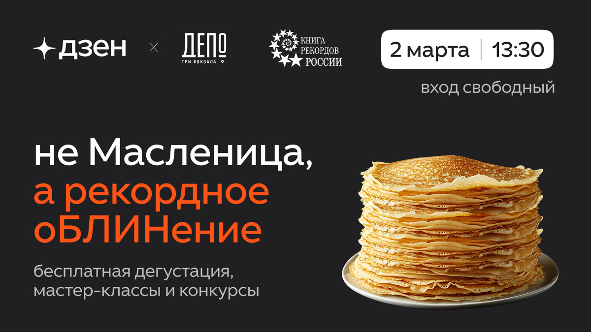 Мы собрали команду поваров, чтобы установить новый рекорд России и испечь более 1000 блинов за 1 час! 🏆 Кому же достанется такая гора блинов? Ну, конечно, вам! Приходите отмечать Масленицу с семьёй и друзьями. Вас ждут: бесплатная дегустация, весёлые конкурсы и мастер-классы. Вход свободный. А готовить для вас будут крутейшие повара во главе с именитыми шефами, авторами Дзена: ✨ Григорий Мосин шеф-повар, фуд-блогер ✨ Алиса Полунина шеф-повар, телеведущая Ждём вас 2 марта в 13:30 в «Три вокзала. Депо».