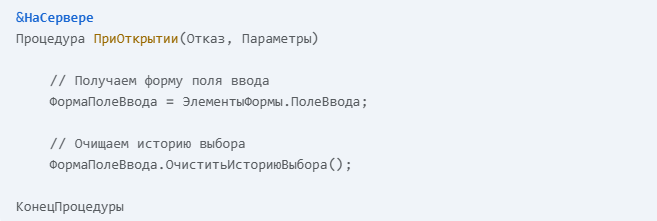 - Если вам необходимо очищать историю выбора программно, например, при открытии формы или по нажатию кнопки, вы можете использовать встроенный язык 1С.