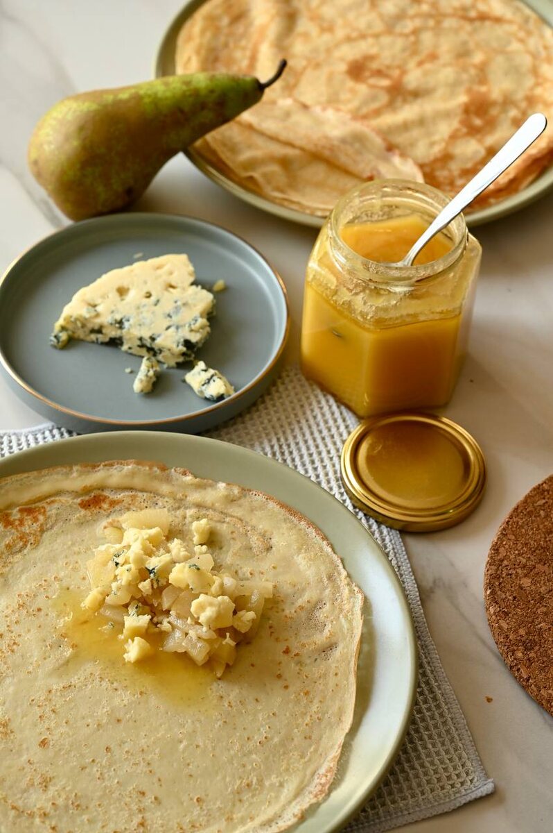 Сегодня решил про экспериментировать с новым вкусом начинки для блинов. Многие же и нас любят сочетание груши, сыра и мёда?! Вот с такой начинкой я решил приготовить блинчики. Честно скажу мне очень понравилась, но начинка на любителя. Поэтому приготовьте, попробуйте один собранный блинчик и если понравится, то собирайте дальше. В общем что я сделал, конечно приготовил блины: 🔸 Мука 200 г 🔸 Сахар 25 г 🔸 Соль 8 г 🔸 Масло растительное 20 г 🔸 Яйцо СО 3 шт 🔸 Молоко 400 г 🔸 Вода 120г Как готовить блинчики вы все знаете. Просто соединяем все ингредиенты в чаше и пробиваем блендером, даем постоять 15 минут и печём на блинной сковороде. Тут всё просто. Далее готовлю Грушевый компоте: 🔸 Груша конференция 500г 🔸 Сахар 30г 🔸 Сливочное масло 30г 🔸 Коньяк 30мл 🔸 Специи (корица, анис, бадьян, имбирь, гвоздика) я взял просто пряничную смесь, можно добавить что-то одно, например корицу. Тоже всё просто, очищаем грушу и нарезаем. На сковороду кладём сливочное масло, подсыпаем сахар и высы