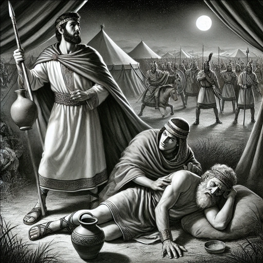 Вы когда-нибудь находились в ситуации, когда жизнь будто подкидывает вам идеальную возможность отомстить или доказать свою правоту? Когда вы смотрите на человека, который причинил вам боль, и понимаете: сейчас всё в ваших руках? Но стоит ли делать то, что кажется таким справедливым? Как удержаться от того, чтобы не использовать своё превосходство? Давид снова сталкивается с Саулом. Это уже не первый случай, когда судьба сводит их вместе в необычных обстоятельствах. После того как Давид пощадил Саула в пещере, Саул вернулся к своему стремлению убить Давида. Однако судьба вновь подарила Давиду шанс. В одну из ночей Давид отправляется в стан Саула, чтобы разведать обстановку. Его верный спутник, Авесса, сопровождает его. Они тихо пробираются мимо спящих воинов и оказываются у самого сердца лагеря — там, где лежит Саул. Рядом с ним — его копьё, воткнутое в землю. Всё вокруг окутано ночной тишиной. Авесса, осознавая уникальность ситуации, шепчет Давиду: «Бог предал твоего врага в твои руки.