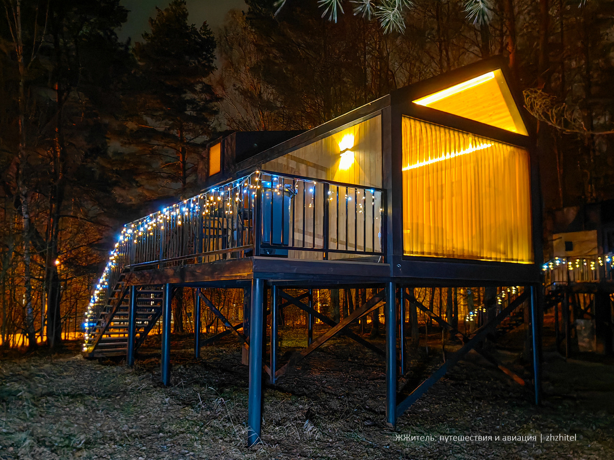 Самую лучшую ночь в нашем путешествии в Тверской области мы провели в Конаково. Это образцовое воплощение модной нынче концепции глэмпинга — отдых на природе (кемпинг), но не в палатке, а в небольшом, очень уютном и комфортном домике. Собственно, слово глэмпинг так образовано: гламур + кемпинг. Домик, в котором мы жили, расположен в роще на берегу Волги. Капитальные строения здесь строить нельзя, поэтому домик поднят на сваях на высоту два с небольшим метра. Необычно и романтично. Внутри домик небольшой, но там есть абсолютно всё: большая кровать, барная стойка, WiFi, кондиционер, холодильник, чайник, микроволновка, посуда. Есть еще одна кровать поменьше на антресольном этаже, то есть, можно разместиться вместе с детьми. Санузел с душем, горячей водой и унитазом. Нет только телевизора, вместо него панорамное окно во всю торцевую стену. Просыпаешь утром, а там — Волга. Из-за того, что дом поднят, обзор получается замечательный. В санузле окно тоже панорамное, но мы все-таки предпочитал