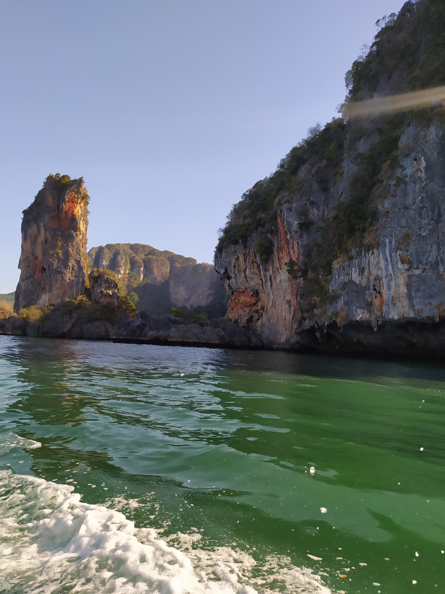 Утром по 100бат/чел уплыли на лодке к Рейли бич. Через скалы по тропе с проверенными веревками отправились к озеру в джунглях, но дочка не осилила треть пути, посидели подождали мужа, вернулся- озеро высохло, говорит, болотце осталось. Лазание простое, но некоторые участки отвесные, жарко и безветренно, джунгли, пот ручьем, тяжко. Все измазались в рыжей пыли, спустились к морю- людно, неуютно, решили вернуться домой и поплавать в более тихом месте вечером.