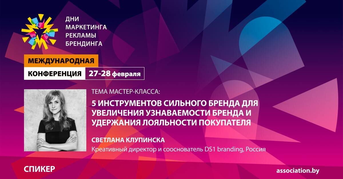 Чтобы привлечь новых покупателей, компании постоянно ищут новые идеи и тратят большие бюджеты. Кроме того, только часть из этих покупателей становятся лояльными, оставаясь с брендом. Поэтому важно в точности понимать потребности, мотивы и боли своей аудитории и, ориентируясь на них, выстраивать прочную связь с ней на основе ценностей и эмоций. Для этого необходимо разобраться в нескольких вопросах: — Какие инструменты и стратегии помогут усилить узнаваемость бренда и укрепить лояльность? — Как легенда бренда формирует восприятие продукта и влияет на поведение покупателей? — Как найти баланс между потребностями аудитории и задачами бизнеса? Эти вопросы рассмотрим на Международной конференции «Дни маркетинга, рекламы и брендинга». 28 февраля в 16:30 креативный директор DS1 branding Светлана Клупинска выступит на мероприятии с темой «5 инструментов сильного бренда для увеличения узнаваемости бренда и удержания лояльности покупателя». Конференция «Дни маркетинга, рекламы и брендинга» пройд