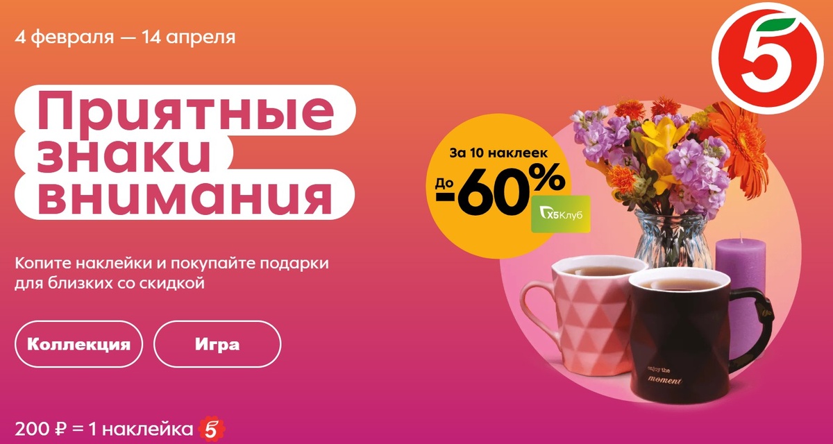 Сеть магазинов "Пятерочка" не перестает удивлять своих покупателей интересными акциями и предложениями. Одна из таких акций - "Приятные знаки внимания", в рамках которой покупатели могут собирать наклейки и выгодно приобретать товары, участвующие в этой акции. Давайте подробнее рассмотрим эту акцию, чтобы понять, как принять в ней участие. Акция стартовала 4 февраля и продлится до 14 апреля. Успейте купить все желаемые товары со скидками, пока они есть в наличии! В акции "Приятные знаки внимания" могут участвовать все зарегистрированные пользователи программы лояльности "Пятерочка". Для этого необходимо стать участником клуба, что довольно просто: достаточно всего лишь скачать приложение "Пятерочка" или зарегистрироваться на сайте сети, указав свои контактные данные. Каждый раз, когда вы совершаете покупки в магазинах "Пятерочка", вы будете получать электронные наклейки, которые затем дадут вам возможность получить скидку на желаемые товары. Электронные наклейки начисляются и при оформ
