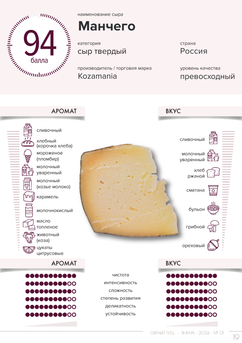 Сыры из козьего молока - существует множество различных видов сыра и каждый из них отличается по вкусу, текстуре, аромату. Как разобраться в этом многообразии? С какого сыра начать знакомство с "козой", чтобы получить максимум удовольствия? В рамках журнала "Сырный гид" дегустирую и анализирую множество образцов, в том числе из козьего молока, благодаря чему у вас есть возможность насладиться лучшими из них. Отличное переложение технологии манчего на козье молоко. Интересный образец сыра с ярко выраженной ароматикой и отличным балансом. Сыр подойдет для сырной тарелки или холодных блюд. Корка сыра при дегустации не ощущается, при этом у сыра нежная, «воздушная» консистенция. Несмотря на козье молоко, козий тон очень аккуратный – в аромате, вкусе, послевкусии. Сыр с отличным балансом. На сыр стоит обратить внимание потребителям, избегающим козье молоко. Однозначное назначение сыра – сырная тарелка и отдельное употребление. Очень хороший образец выдержанного сыра. Сыр интересен отличным