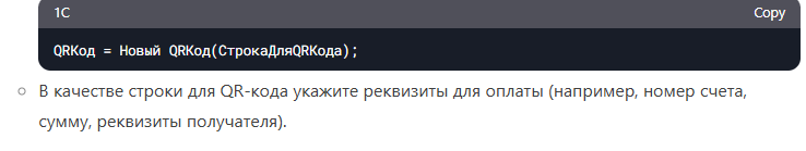 Для создания счета с QR-кодом в 1С необходимо использовать функционал, связанный с формированием электронных документов и печатных форм. QR-код обычно содержит реквизиты для оплаты (например, номер счета, сумму, реквизиты получателя и т.д.). Ниже приведена пошаговая инструкция: Если в вашей конфигурации нет стандартной печатной формы с QR-кодом, выполните следующие шаги: Эти шаги помогут вам создать счет с QR-кодом в 1С:Предприятие 8.