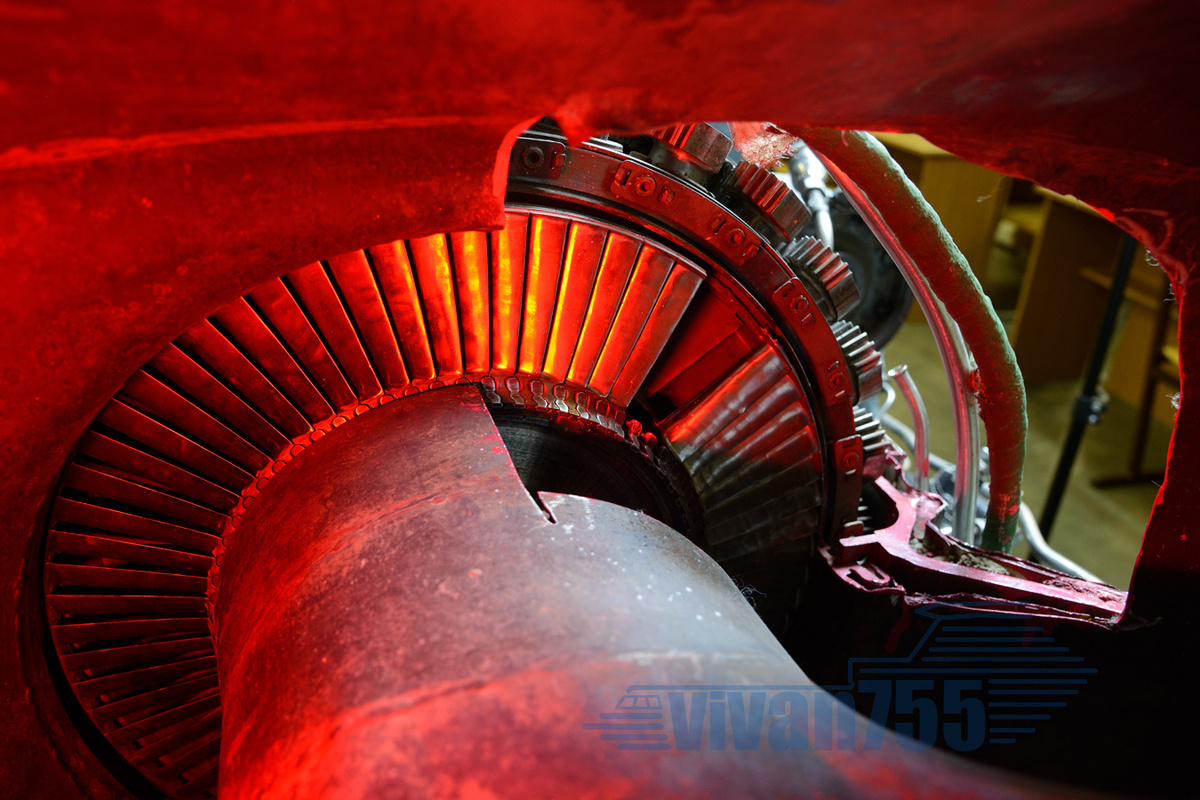 Рычаг, показанный зелёной стрелкой, поворачивается от педали газа, но мехвод во время движения этой педалью работает мало, тягой управляет сопловым аппаратом, потому что у двигателя, как и положено ГТД, плохая приёмистость.