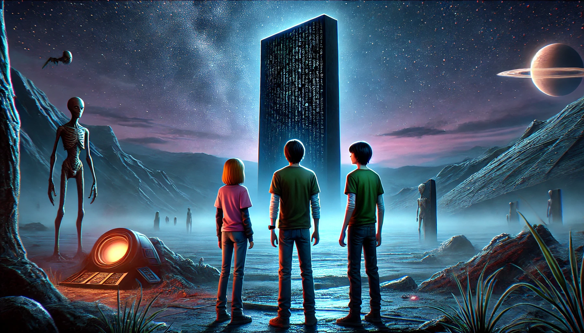 Они путешествовали среди миров, но это место было иным. Это была планета, затерянная в глубинах космоса, скрытая от глаз цивилизаций, забытая даже временем. Небо над ними переливалось тусклым светом далёких звёзд, и всё вокруг казалось застывшим, словно само пространство решило замедлить своё течение. — Это место кажется... пустым. — тихо сказала Лили, оглядываясь. — Может, оно и должно быть таким?! — ответил Эл, ступая по покрытой песком поверхности. Рами шёл впереди, внимательно всматриваясь в горизонт. Вдалеке виднелось что-то похожее на монолит — тёмный, угловатый, словно отголосок другой эпохи. Они приблизились и увидели, что поверхность монолита была покрыта странными знаками. Они не светились, не пульсировали, но их присутствие ощущалось, будто древняя энергия ждала момента, чтобы пробудиться. — Здесь есть что-то! — прошептал Рами, касаясь холодного камня. И в этот момент мир изменился. Небо над ними вспыхнуло. Свет не исходил от солнца или далёких галактик — он шёл от самой стр