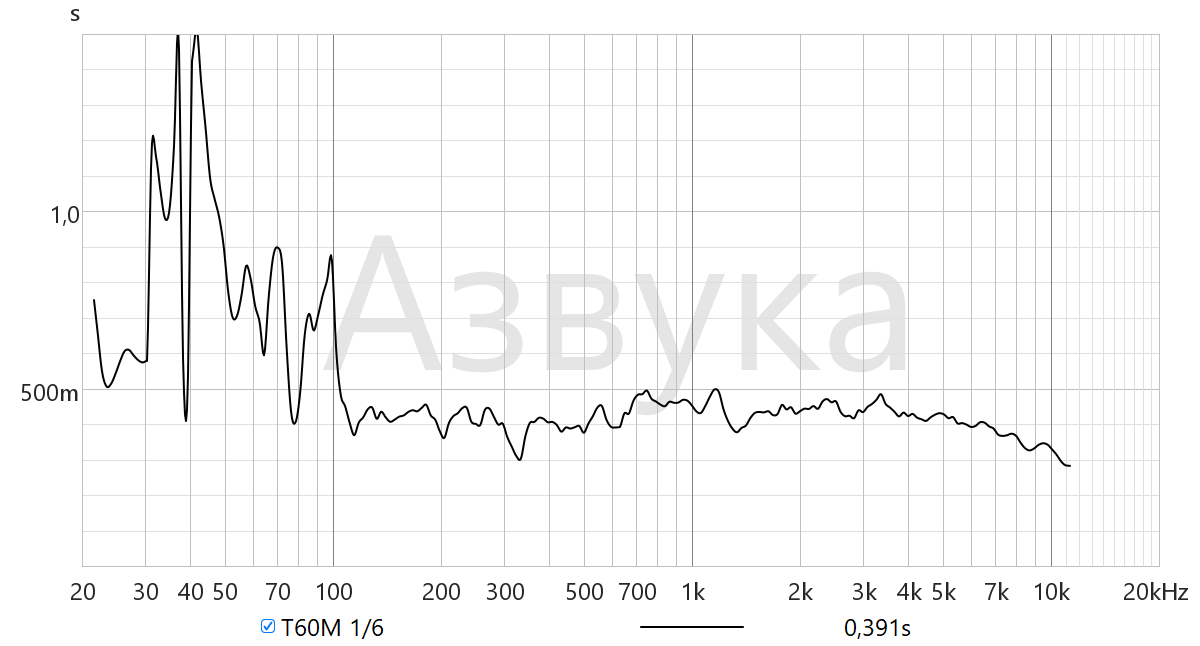 Видим что на основном частотном диапазоне время реверберации составляет 400-500мс. С небольшим снижением к высоким частотам и заметным подъемом на низах. Этот график показывает типичную ситуацию для комнат среднего размера, в которых аудиолюбители устанавливают свои акустические системы и слушают музыку.