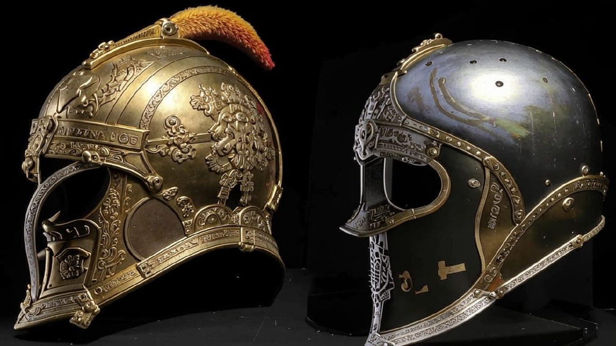 🎭 Шлемы-сферулы и барбуты – закрывали лицо, оставляя небольшие прорези для глаз.