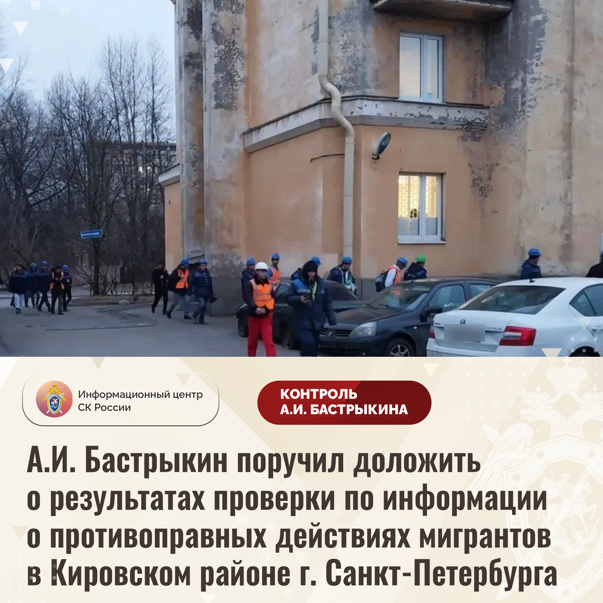 А.И. Бастрыкин поручил доложить о результатах проверки по информации о противоправных действиях мигрантов в Кировском районе г. Санкт-Петербурга В комментариях в приемной Председателя СК России А.И. Бастрыкина «ВКонтакте» размещено обращение о функционировании хостела для мигрантов по улице Оборонной в городе Санкт-Петербурге. С декабря 2023 года иностранные граждане проживают в офисных помещениях, предназначенных для размещения банка. При этом постояльцы систематически нарушают общественный порядок и режим тишины, не соблюдают санитарные нормы. Местные жители опасаются за собственную безопасность, а также за жизнь и здоровье своих детей, однако их многочисленные обращения результатов не принесли. Ситуация освещалась в СМИ и социальной сети. В ГСУ СК России по городу Санкт-Петербургу по доводам, изложенным в комментарии, начата процессуальная проверка. Председатель Следственного комитета Российской Федерации Александр Иванович Бастрыкин поручил и.о. руководителя ГСУ СК России по город
