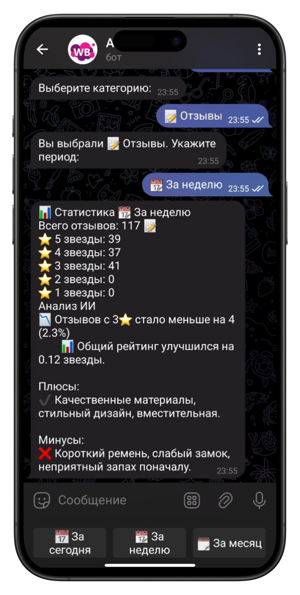 Для многих продавцов Wildberries превращается в бесконечную рутину: Однажды к нам обратился продавец с Wildberries с типичной проблемой: он тратил больше 2 часов в день, чтобы просто проверять и обрабатывать отзывы и вопросы от покупателей. Негативные отзывы часто оставались без ответа или обрабатывались слишком поздно, что снижало рейтинг и, как следствие, продажи. Клиент понимал, что так продолжаться не может, и пришёл за решением. Мы предложили разработать Telegram-бота с искусственным интеллектом, который возьмёт всю рутину на себя. 1. Ручная проверка отзывов и вопросов:Продавец каждый день заходил в личный кабинет Wildberries, проверял новые отзывы и вопросы, записывал их в таблицу, а потом отвечал. Это занимало уйму времени и сил. 2. Опоздание с ответами на негативные отзывы:Один плохой отзыв, оставшийся без внимания, мог опустить рейтинг товара. Из-за этого товар терял позиции в поиске Wildberries. 3. Отсутствие аналитики:Продавец не видел общей картины. Сколько отзывов положит