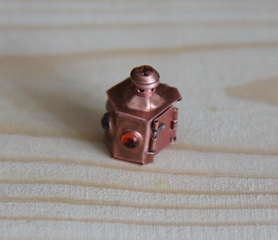В предыдущих материалах я рассказывал о простейшем подходе в изготовлении таких деталей светильника, какими являются крышечка и дно. Детали при этом способе изготовления формировались из единого кусочка фольги путем ее сгибания и минимальной плоскостной деформации. Однако, как оказалось, с помощью даже такого примитивного подхода вполне реально добиваться незаурядных результатов. Поэтому прежде чем знакомить посетителей канала с более сложными вариантами изготовления подобных элементов, будет целесообразно, на мой взгляд, показать результат достижимый по мере приобретения уже самых минимальных навыков работы с фольгой. Для этого будет вполне достаточно научиться раскраивать кусочки фольги, получать на ее поверхности рельефные очертания геометрических фигур, аккуратно сгибать материал по разметочным линиям. Передо мной стояла задача сделать модель наподобие фонаря отличительного трехцветного представленного на следующих картинках. При значительном уменьшении масштаба модели копируемого