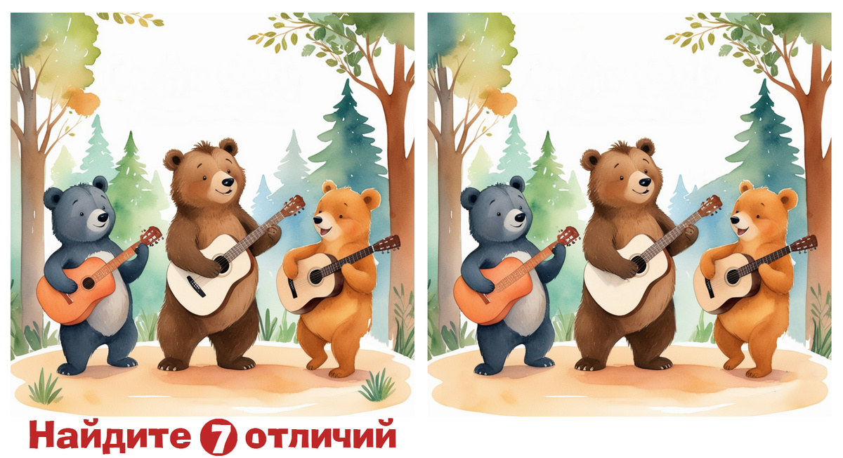 Как говорят музыканты: "Внимание к мелочам делает музыку ещё громче!" Молодой Медведь Митрофан и его приятели на лесной поляне дают концерт. Виртуозно играет Митрофан на гитаре. И приятели хороши. Весь лес веселится под звуки зажигательной мелодии. Но что-то не так… Может, ноты поменялись? Или кто-то из гитаристов стал немного другим? Найди 7 отличий и наслаждайся музыкой. Горизонтальная картинка: Картинка для телефонов: Опять всё правильно, ну кто бы сомневался! Тебя не проведёшь. Береги себя, до следующего раза!