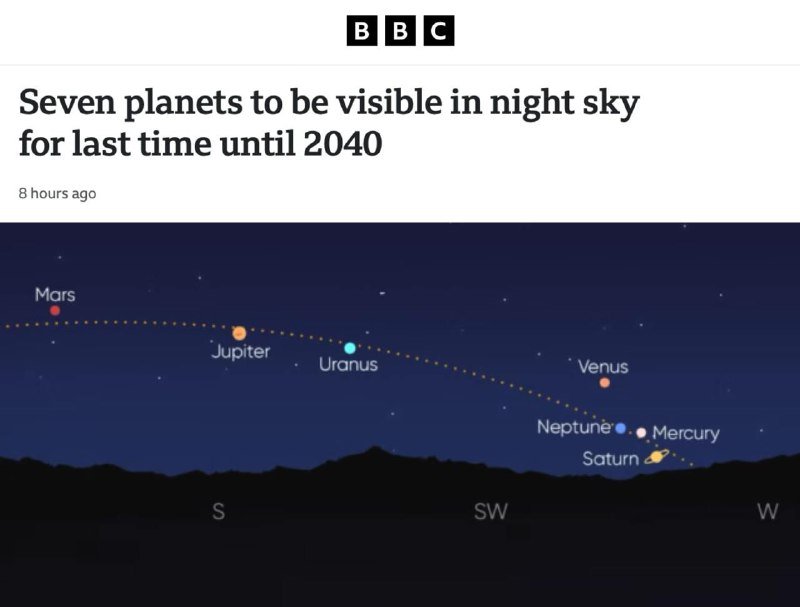 Последний шанс в ближайшие 15 лет увидеть все 7 планет ОДНОВРЕМЕННО: только на этой неделе Меркурий, Венера, Юпитер и Марс будут видны без телескопа. Специалисты рекомендуют уйти из города и найти место с открытым горизонтом — так космические тела будет лучше видно. В городе подойдут крыша или балкон многоэтажки. Самое ВАЖНОЕ — перед тем, как посмотреть наверх, на 30 минут отлипнуть от телефона. Так глаза привыкнут к темноте. В среду, четверг и пятницу вечером обязательно идём на улицу.