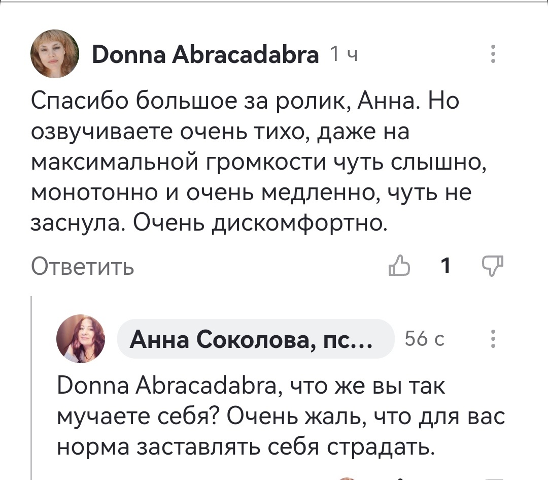 Информация пригодилась, спасибо. Но мне пришлось напрягаться, чтобы услышать ее, понять и смириться с тем, что нужными мне знаниями владеет человек с негромкой медленной речью. Мир не прогибается под меня, не соответствует моим запросам и ожиданиям. И сейчас я накажу его за это в лице автора ролика, который меня раздражает. Со мной так делали мои родители, я ощущал полную беспомощность и страдал. Поэтому хочу взять реванш.