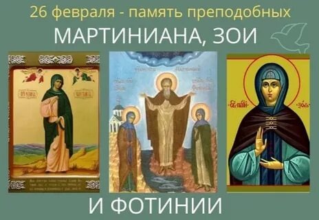 26 февраля 2025 года - среда, 3-я приуготовительная седмица к Великому посту. Сырная - сплошная В этот день Русская Православная Церковь чтит память: — Преподобного Мартиниана Кесарийского (Палестинского) (V) — Святителя Серафима (Соболева), архиепископа Богучарского (1950) — Священномученика Гавриила Преображенского, пресвитера (1919) ------------------------------------------- 💞 Сегодня именины празднуют: Мартиниан, Серафим, Евлогий, Симеон, Стефан, Василий, Гавриил, Зосима, Николай, Иоанн, Леонтий, Владимир, Парфений, Михаил, Евгений, Павел, Зоя, Фотиния, Светлана, Вера, Анна, Ирина Поздравляем всех именинников с днем Ангела! Желаем им крепкого здоровья, духовной радости и Божьего благословения. ------------------------------------------- 🍵 ПОСТ И ТРАПЕЗА 26 февраля 2025 г., среда, поста нет ------------------------------------------- 💠ИСТОРИЧЕСКИЕ СОБЫТИЯ — 26 февраля 1815 г. Наполеон Бонапарт совершает побег с острова Эльба — 26 февраля 1832 г. император Николай I объ