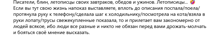 Тут народ однажды удивился, обнаружив, что я читаю своих конкуренток, которые каждый день выходят в эфир, рассказывая о всех своих физиологических проявлениях. Типичный текст, который высоко оценивает робот Дзена, в отличие от моих: "Я встала. Посмотрела налево. Потом направо. Долго искала тапочки. Нашла. Возможно, сделаю на завтрак яичницу. Пока не определилась. Черный или белый хлеб? Даже не знаю. На улице холодно. Пойду или нет, еще не знаю. Живу не очень дома. Решила съездить в другой город к своей подписчице. Взяла боковое верхнее в плацкарте. Ненавижу поезда". Из комментариев людей, еще не утративших здравый смысл: Каждое утро у меня начинается с просмотра доски предупреждений, где мне сообщают, что я "ограничена в просмотрах", "лишена монетизации". Я отвечаю жестко. Иногда, наверное, чересчур, потому что вчера мне написали, что прекратят переписку, если я буду их оскорблять. А мне приходится каждый раз, когда я ставлю такую заметку, как "Три года" писать им превентивно, что