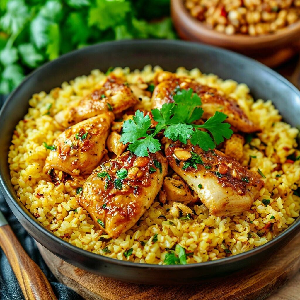 Булгур - 200 г Куриное бедро - 460 г Морковь - 150 г Лук репчатый - 140 г Масло растительное - 3 ст.л. Соль - по вкусу Приправа для плова - 1 ч.л. У куриного бедра удаляем кость и при желании кожу. Нарезаем куриное мясо небольшими кусочками. В толстостенной кастрюле разогреваем растительное масло, выкладываем туда куриное мясо и обжариваем на среднем огне до изменения цвета. Это займёт 7 минут. Тем временем лук и морковь очищаем. Лук нарезаем мелкими кубиками, морковь - средней соломкой. К курице отправляем лук и морковь. Обжариваем, пока овощи не станут мягкими, 8 минут. Булгур при желании промываем и выкладываем к курице с овощами. Вливаем воду (400 мл), всыпаем соль и приправу для плова. Перемешиваем, доводим до кипения, уменьшаем огонь до минимального и готовим 15 минут, до готовности булгура и выпаривания воды. Готово.