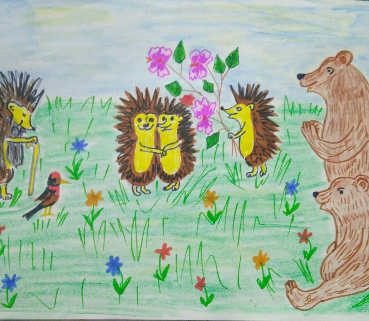 Часть седьмая. Не успели ходоки зайти в лес, как раздалось знакомое - ахтунг, ахтунг, ежи перебежчики. Друзья посмотрели в сторону звуков и увидели двух волков, толстого и худого. Все тех же, в фуражках с кокардами и ремнях. - мы .. начал было Тишка.. Но его сбил с ног , выкатившийся шариком из кустов Миша . Медвежонок хотел что то сказать, но только улыбался и похрюкивал от удовольствия. - и че вы тут ходите, смерти ищете? Прорычала тетя Марина, обращаясь к волкам. Она вышла из леса вслед за своим сыном. - нееет, женщина медвежья, начал вилять хвостом волк, что вы, мы просто это.. мы охраняем. Мы порядок.. опасно в лесу..мы предупредить деток. - в лесу не опасно. Опасно рядом с вами. Сказала, как отрезала медведица. И добавила емко - уходите. Волки быстрыми шагами ушли откуда пришли. - ребята, радостно проговорил Миша, а мне голубь , камнем на голову свалился, как метеорит с неба упал. Записочку отдал. Я хотел один идти встречать, да мама не пустила. Мы вместе пришли Друзь