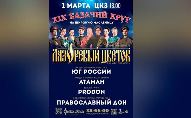 В Центральном концертном зале Волгограда откроется фестиваль-концерт «Казачий круг на широкую Масленицу». Традиционное празднество собирает друзей в 19-й раз. Прославленный ансамбль «Лазоревый цветок» (руководитель — заслуженный артист России Геннадий Сипотенков) выступит вместе с лучшими мастерами песенного казачества. И не только песенного. Какая ж песня без пляски? Какая Масленица без хоровода? Концерт состоится 1 марта, начало в 18 часов. 6+ До него, в 16:30 в фойе ЦКЗ откроется выставка подлинных костюмов и бытовой утвари казаков. Вход свободный. Все вопросы по телефонам: 38-21-96, 38-66-00.