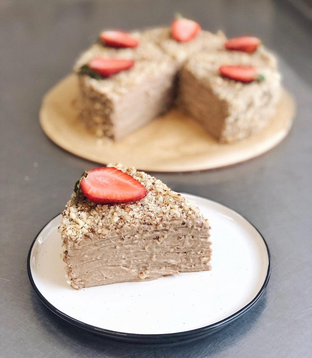 Собирала в разъемной форме, потому такой ровный, сверху обсыпала фундуком. Блинчики у меня были где-то 20 см в диаметре.