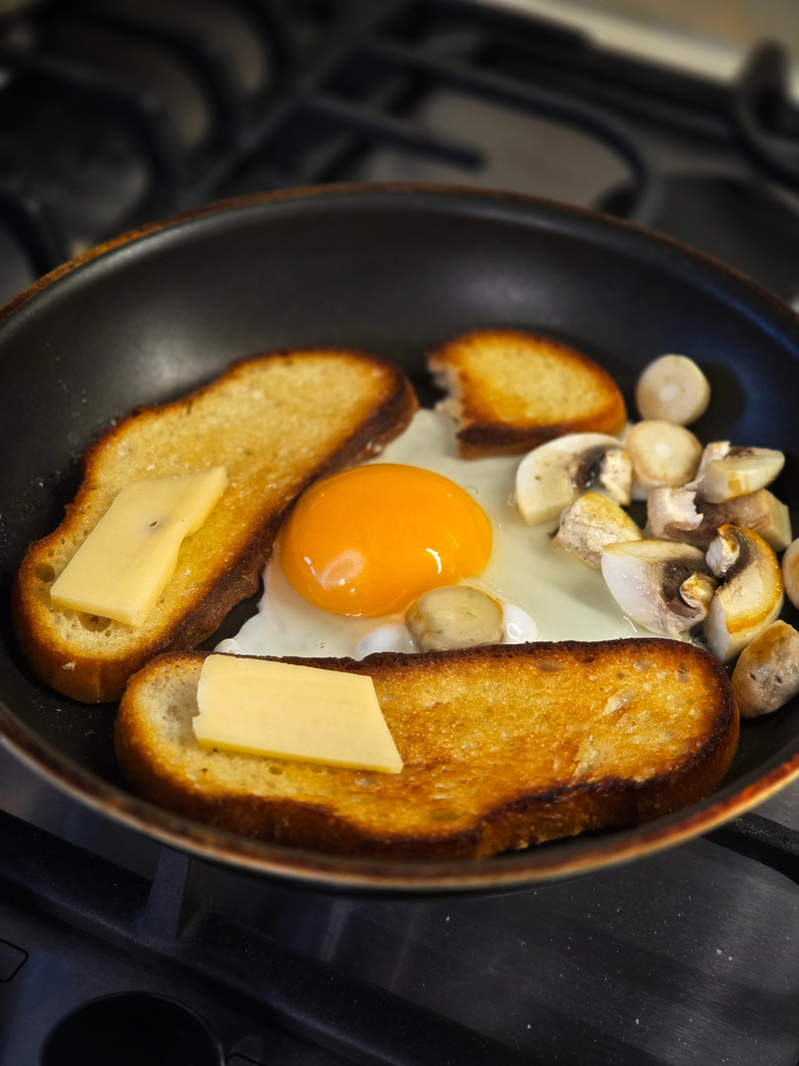 На завтрак делала свое любимое блюдо: поджареный батон и яйцо, шампик еще один добавила