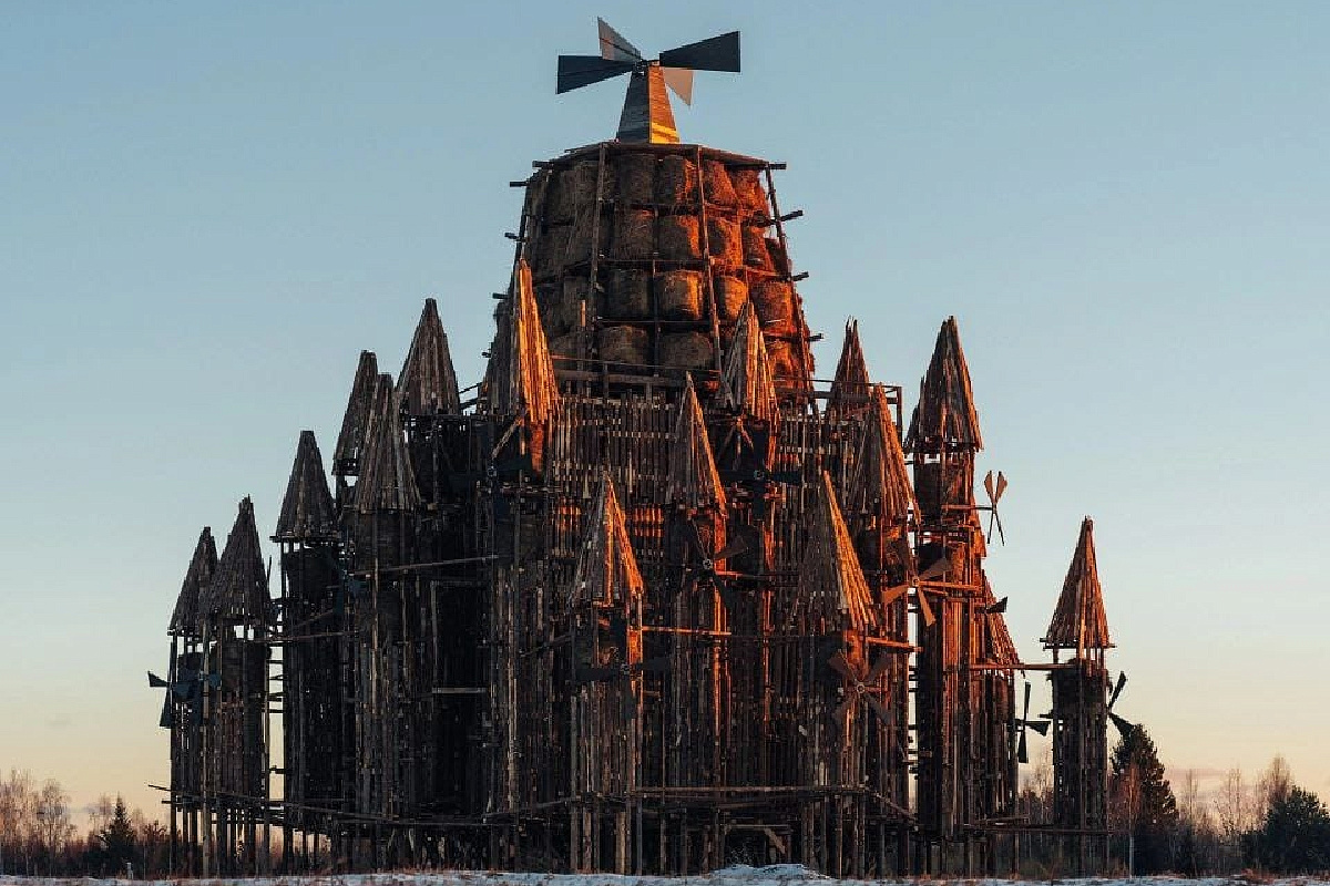 этом году на Масленицу в Калужской области сожгут деревянный замок высотой 26 метров. Этот арт-объект, состоящий из 24 башен-мельниц, был