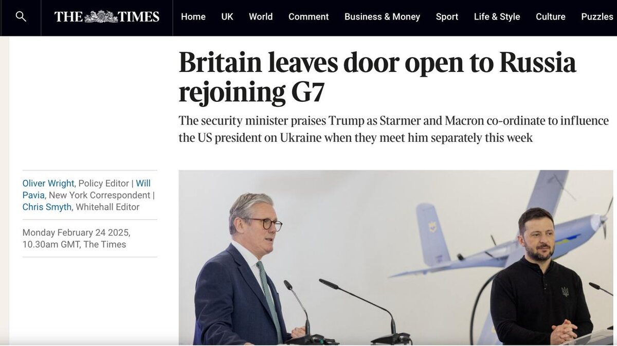 \Чтобы остановить войну: Премьер Британии обсудит с Трампом возвращение России в "Большую семерку" ▪️Об этом сообщил The Times британский министр безопасности Дэн Джарвис, не став исключать вероятности возвращения РФ в G8. ▪️Недавно вернуть Россию в «восьмерку» предложил Трамп. ➖«Это будет вопрос, который будет обсуждаться с международными союзниками. И это вопрос, который, без сомнения, будет рассмотрен в тот момент, когда конфликт на Украине будет завершен», - заявил министр. ▪️Он добавил, что Стармер «обсудит эти вопросы с президентом США позже на этой неделе». Это рассматривается как мотивация для России прекратить войну. ▪️Ранее Германия высказалась против возвращения РФ в G8. ▪️При этом в Москве заявили, что не заинтересованы в возвращении в восьмерку.