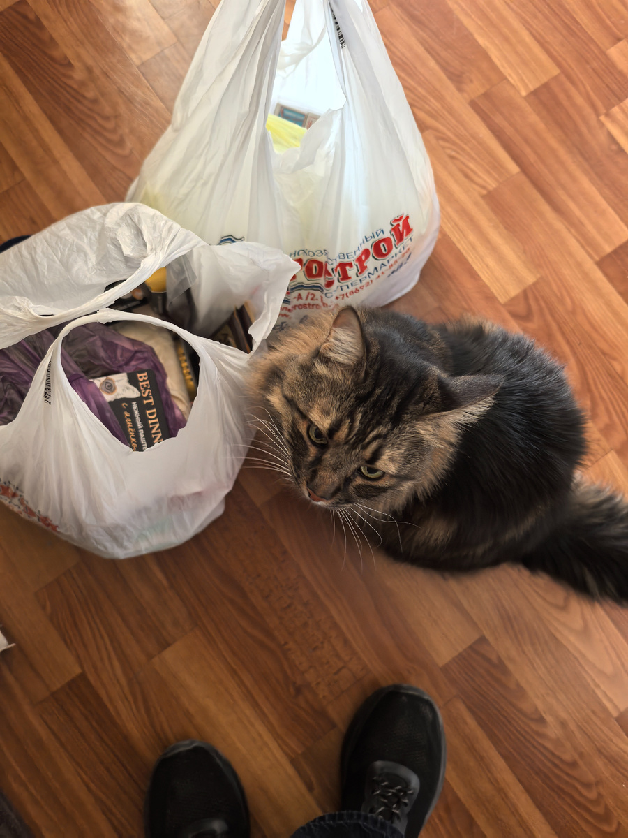Всем привет! С вами Кузя Кусалочкин и сегодня я расскажу почему я стал Возмущалочкин. Утром получил паштетик. Но через время мне опять захотелось есть. Хозяйка решила дать мне ещё немного паштетика. Потом у меня активность проснулась и хозяйка со мной поиграла. Правда, я кусался и даже царапался. Обещали сделать лапикюр. А ещё я обхитрил хозяйку и поиграл в мою любимую игру. Это когда я прячусь под стол и резко нападаю на ноги. Людишки ругаются... особенно хозяин не любит эту игру. Хозяйка куда-то ушла. Не забыла отчитаться во сколько будет. Пришла вовремя, принесла пакеты: Потом пошла на кухню. А я так возмущенно ей сказал «няф». Хозяйка глянула на миски и всё поняла: Стала говорить «Сейчас, сейчас, Кузенька, я тебе фаршик дам». Пока хозяйка соображала мне еду, я ещё немного повыкачивался по полу. Просто солнышко светило и даже грело. Меня покормили и я перестал быть Возмущалочкиным. Кстати, перед уходом мне хозяйка оставила мяско, но я всё съел. Как положено, я проверил что там
