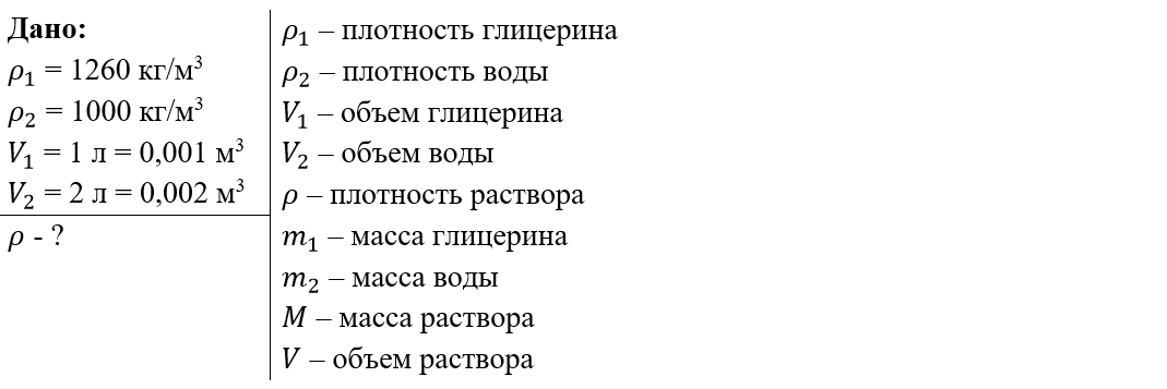 1 литр глицерина и 2 литра воды наливают в сосуд и аккуратно перемешивают. Считая, что объем смеси жидкостей равен сумме их начальных объемов, определите плотность образовавшегося раствора.