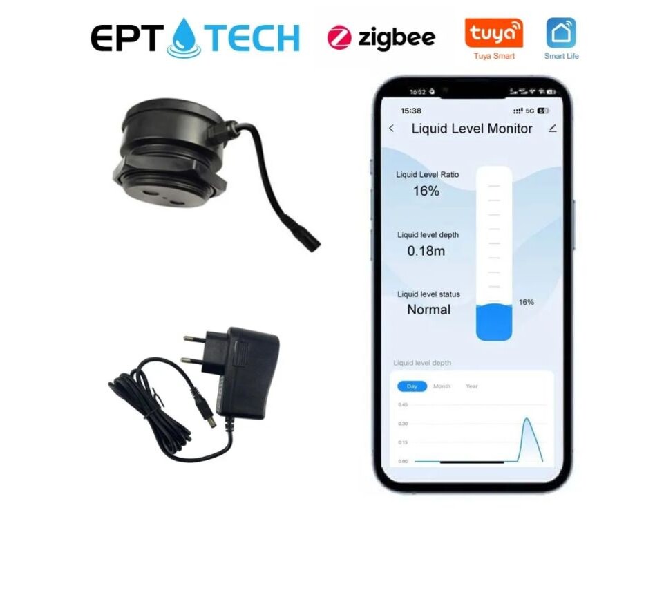 Часто возникает задача отслеживать уровень воды в ёмкости. Это может быть колодец или ёмкость для полива. Один из вариантов решения ультразвуковой датчик уровня. На рисунке датчик EPTTECH. Выпускается в вариантах wi-fi и zigbee. И исполнение wi-fi Датчик устанавливается в верхнюю часть ёмкости или крышку люка. В зависимости от исполнения могут быть разные минимальные расстояния до воды и максимальное расстояние до дна. В характеристиках датчика EPTTECH TLC2206-ZB ZigBee3.0 заявлено минимальное расстояние 10см. Максимальное 2,5м.( Проверяйте этот параметр у конкретной модели датчика). В приложении в настройках эти параметры указываются в процентах от общей высоты ёмкости. По этим уставкам настраиваются уровни выдачи сигнала аварии по минимальному и максимальному уровню. Заявлено максимальные расстояния до шлюза zigbee 30м . Верится в это с трудом. Во всяком случае для zigbee шлюза без антенн, и установке шлюза внутри помещения, эти расстояния явно завышены Обращайте внимание на дл