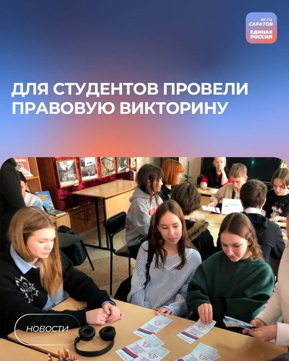 📖Организовать правовую викторину помогло местное отделение партии «Единая Россия» Октябрьского района Саратова. В Центральной городской библиотеке для детей и юношества состоялась правовая викторина «Мы – будущие избиратели», в которой приняли участие студенты Саратовского архитектурно-строительного колледжа. Депутат Саратовской городской Думы Ирина Видина поприветствовала ребят и рассказала о своём опыте работы в избирательной кампании. Викторина состояла из восьми туров, касающихся выборов и деятельности избирательных комиссий. Ответы ребят оценивала председатель территориальной избирательной комиссии района Марина Сырова. 💬«Понимание избирательного процесса — это важный аспект, позволяющий студентам активно принимать участие в будущих выборах», - поделилась Ирина Видина.