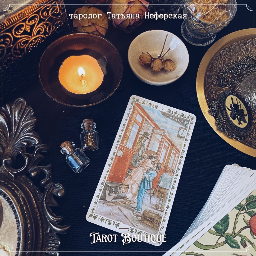 Романтическое Таро – это колода оракульного типа, посему, между «что значит 7 жезлов по классике Уэйта?» и «о чем нам говорит картинка на карте?» предпочтение отдаем второму, то есть нарисованному сюжету, отметая стояние "один против всех".