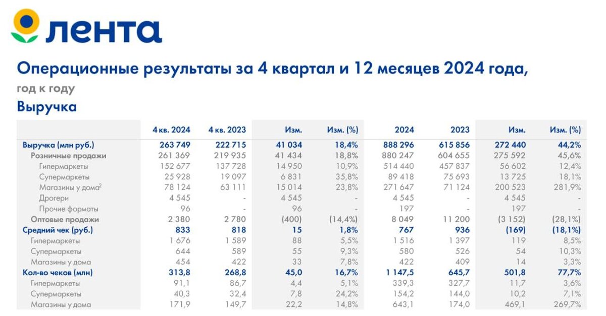 Вот и подошел тот отчет, в котором уже нет низкой базы до покупки сети дискаунтеров "Монетка". Теперь бизнес можно смотреть на стабильной основе. Добавились дрогери "Улыбка Радуги", но их влияние в отчетном квартале еще было невелико, на фоне всей выручки. Давайте разберем свищи операционный отчет за 2024 год. Итак, сопоставимые продажи LFL помогут сравнить показатели за период у одних и тех же торговых объектов с аналогичными характеристиками. Рост LFL продаж +11,3% за 4-й квартал и +12,7% по году. Немного отскочил трафик покупателей, который был на грустных околоотрицательных уровнях прироста. Годовой рост сделан средним чеком, выросшим на 10,6%, трафик по всей группе дал лишь +1.8% роста. Чек то постоянно растет за счет фактора инфляции, но отток покупателей всегда негативно влияет на розничную торговлю. У Ленты с этим проблемы уже не первый год, и даже этот квартал - не более, чем отскок. Гипермаркеты держатся стабильно. Сегмент еще и не вымер как класс, но и не развивается, всего