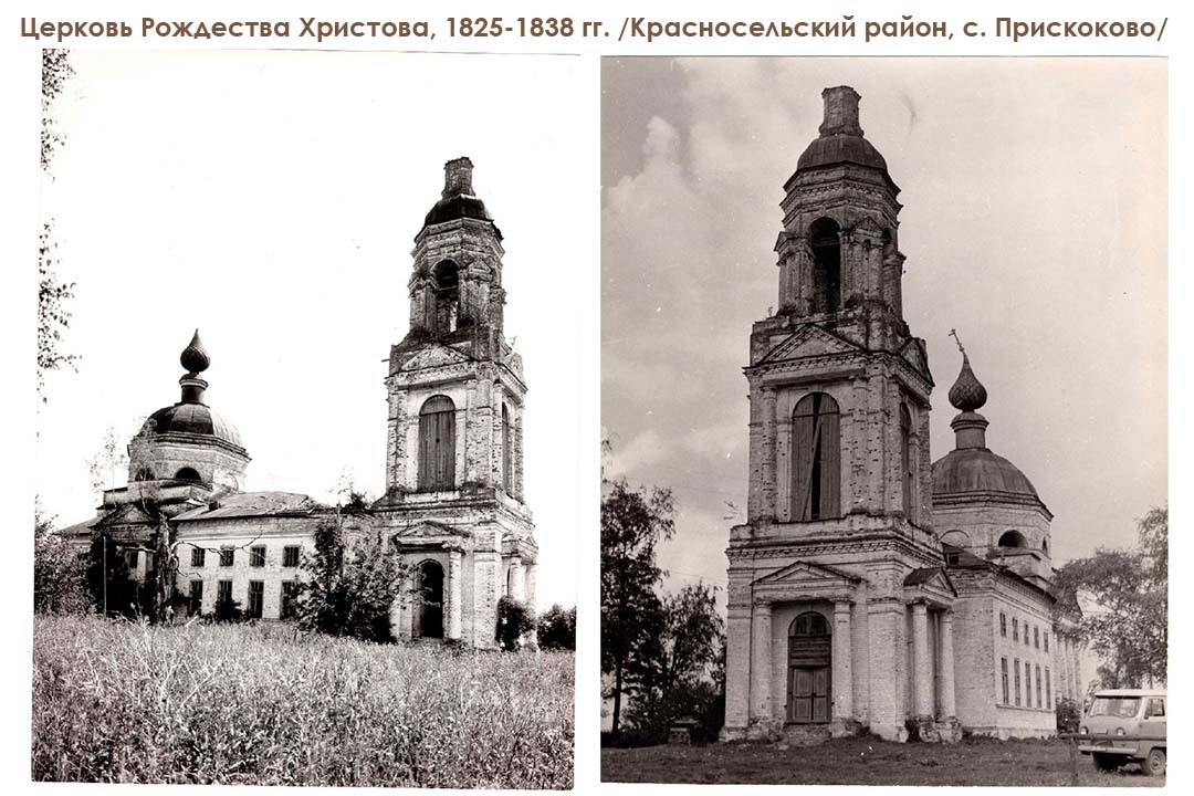 Инспекция по охране объектов культурного наследия занялась памятником архитектуры В селе Прискоково Красносельского района будут восстанавливать старинную церковь Рождества Христова. Приказом инспекции был утвержден предмет охраны данного памятника культуры регионального значения, поэтому реставрационные работы не заставят себя долго ждать. По данным различных источников построена церковь была в 1838 году. Однако при обследовании здания специалисты обнаружили летопись храма на стене трапезной. Там указано, что церковь заложена в 1825 году по заказу и на средства купца Ивана Маянского и дворянина Николая Карцова. Освятили храм в 1832 году. Церковь представляет собой здание в стиле классицизма с нарядными фасадами. Колокольня имеет три яруса, прежде они венчались шпилем на граненом куполе гуськового профиля. Вдоль боковых фасадов четверика и по восточной стене алтаря — портики. Масляная живопись на стенах и сводах церкви появилась в 1911-м, но до наших дней не сохранилась. Состояние росп