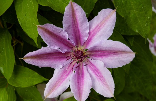 Клематис с красивыми простыми цветками лилового цвета с розовым оттенком и розовой продольной полосой в середине лепестка. Лепестки заостренные по кончикам, что придает цветку звездчатую форму, и слегка волнистые по краям. Тычинки кремово-пурпурные. Цветет двумя волнами в начале и в конце лета, второе цветение более скромное. Лиана длиной около 2 метров. Обрезка слабая. Зимует с укрытием и окучиванием. Морозостойкость до -35 градусов.